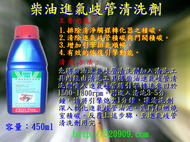 | 柴油進氣歧管清洗劑能清洗進氣歧管讓進氣順暢恢復柴油車扭力與馬力柴油進氣歧管清洗劑能減少柴油車微粒物質或煙灰產生,有效地延長微碳粒子過濾器使用壽命. |