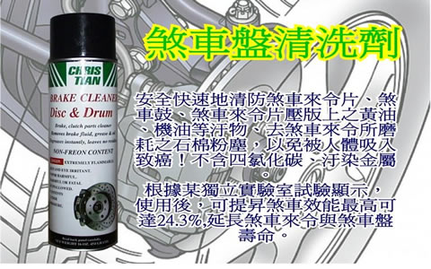 安全快速地清防煞車來令片、煞車鼓、煞車來令片壓版上之黃油、機油等汙物、去煞車來令所磨耗之石棉粉塵,以免被人體吸入致癌!無殘留,不傷及所有橡膠件,本品不殘留雜物、無閃點或著火點、不含四氯化碳、汙染金屬,根據某獨立實驗室試驗顯示,使用後,可提昇煞車效能,最高可達24.3%,延長煞車來令與煞車盤壽命。