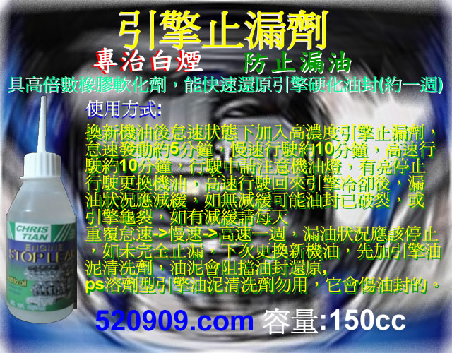| 高濃度引擎止漏劑,具高倍數橡膠軟化劑,能快速還原引擎硬化油封(約一週) |